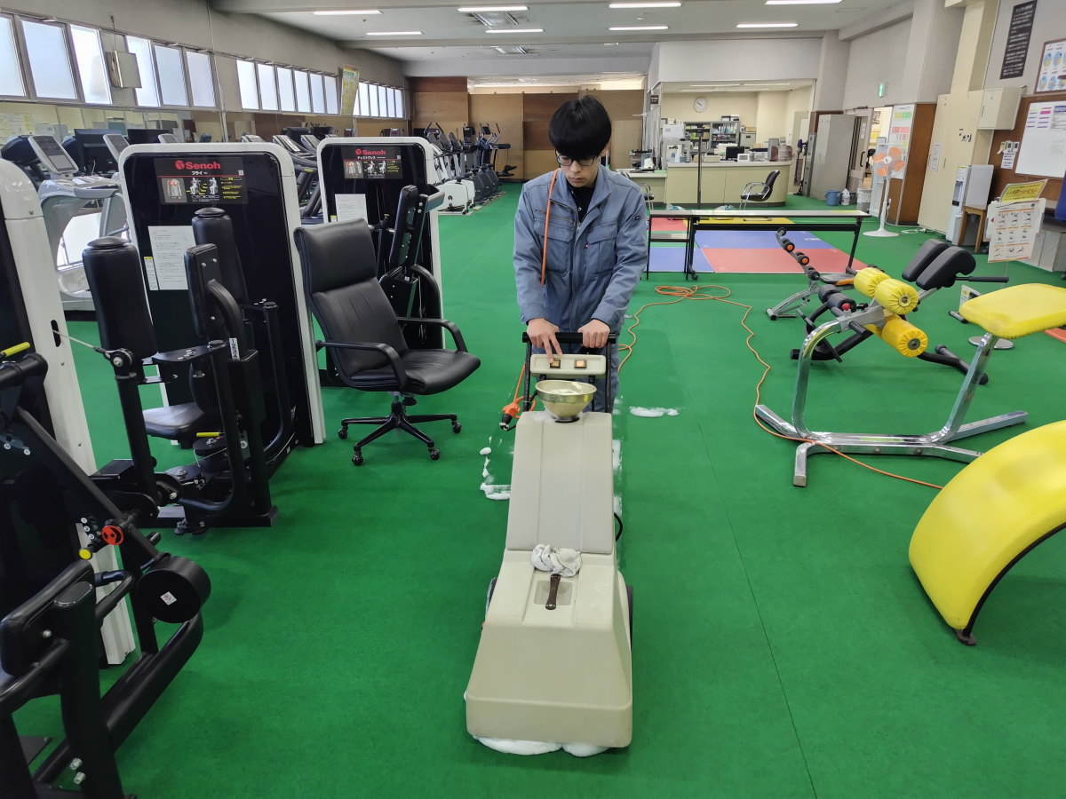 写真or説明文:ホテル・事務所ビルなどの床タイルや、体育館アリーナなどの汚れをポリシャーで落とし(汚れがひどい場合は機械で剥離したあと)、ワックスを塗布します。